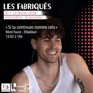 Depuis 2016, la Fabrique de Théâtre ouvre ses portes aux professionnel·le·s des arts vivants (programmatrices et programmateurs du Hainaut et d’ailleurs…) à l’occasion d’un événement culturel regroupant les créations issues des résidences développées en ses murs – soit : “les Fabriqués” (spectacles aboutis) et “les Préfabriqués” (spectacles en cours de développement).